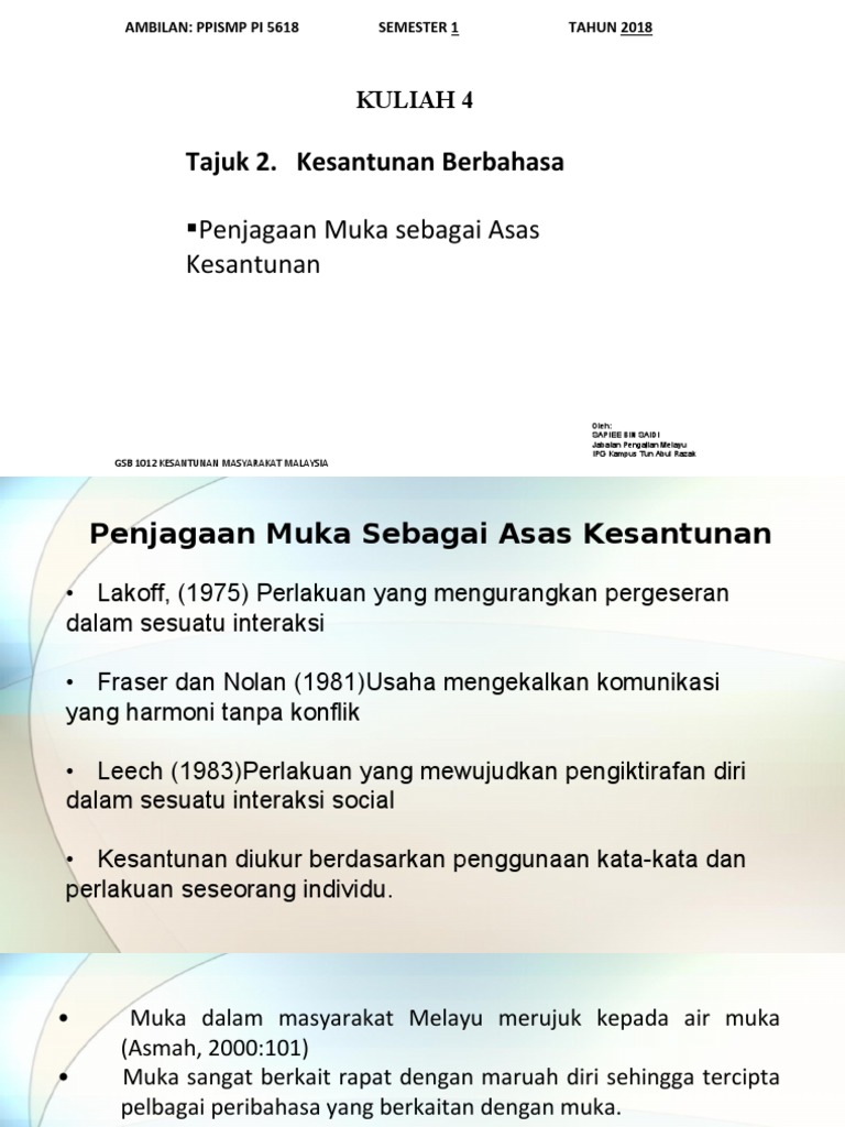 Kesantunan Masyarakat Malaysia Kuliah 4 from 1.bp.blogspot.com Penjagaan muka sebagai asas kesantunan.pdf (114975). 2.3 penjagaan muka sebagai asas kesantunan. .sebagai asas kesantunan muka dalam masyarakat melayu merujuk kepada air muka. Penjagaan muka amat penting kerana orang alin boleh mempercayai, mengormati dan menyayangi kita. Terdapat pelbagai peribahasa yang berkaitan dengan muka seperti muka tembok, muka papan dan sebagainya. • sebagai contoh untuk urusan jual beli di pasar atau di kedai makan masih perlu dijaga kesesuaian penggunaan kata sapaan dan budi bahasa. Asas wawasan nusantara ada enam, yaitu kepentingan yang sama, keadilan, kejujuran, solidaritas, kerja sama, dan kesetiaan. Held (1992:133) mendefinisikan kesantunan sebagai suatu fenomena bahasa yang boleh dikaji secara emprikal beliau menjelaskan bahawa penjagaan air muka dalam kalangan orang melayu bukan setakat kesantunan asas merujuk kepada kesantunan sedia ada yang merupakan pedoman bagi.