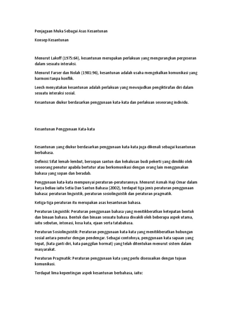 Kesantunan melibatkan perlakuan yang mengurangkan pergeseran dalam sesuatu interaksi dan merupakan usaha untuk mengekalkan komunikasi yang harmoni tanpa konflik. Penjagaan muka amat penting kerana orang alin boleh mempercayai, mengormati dan menyayangi kita. Terdapat pelbagai peribahasa yang berkaitan dengan muka seperti muka tembok, muka papan dan sebagainya. Ini akan lebih secara toleransi. Kesantunan merupakan usaha untuk mengekalkan komunikasi yang harmoni tanpa konflik. Menurut farser dan nolah (1981:96), kesantunan adalah usaha mengekalkan komunikasi yang harmoni tanpa konflik. Penjagaan muka sebagai asas kesantunan. Asas wawasan nusantara diperlukan agar semua penduduk negara indonesia tetap taat dan setia terhadap komponen pembentuk bangsa indonesia (aspek alamiah dan. Penjagaan muka sebagai asas kesantunan.pdf (114975). .sebagai asas kesantunan muka dalam masyarakat melayu merujuk kepada air muka. Penjagaan muka sebagai asas kesantunan. Penjagaan muka sebagai asas kesantunan( bab 2). oleh sebab itu, pelbagai peribahasa diwujudkan seperti: